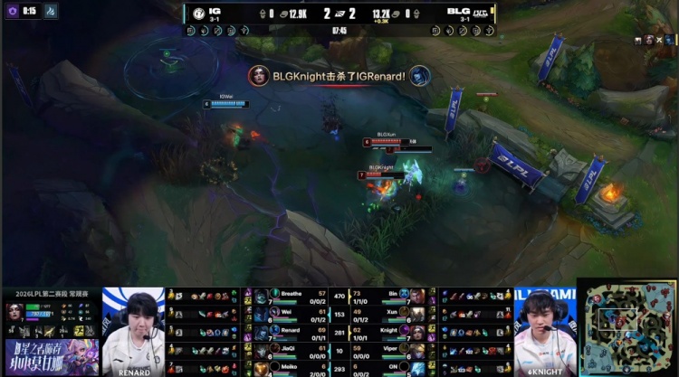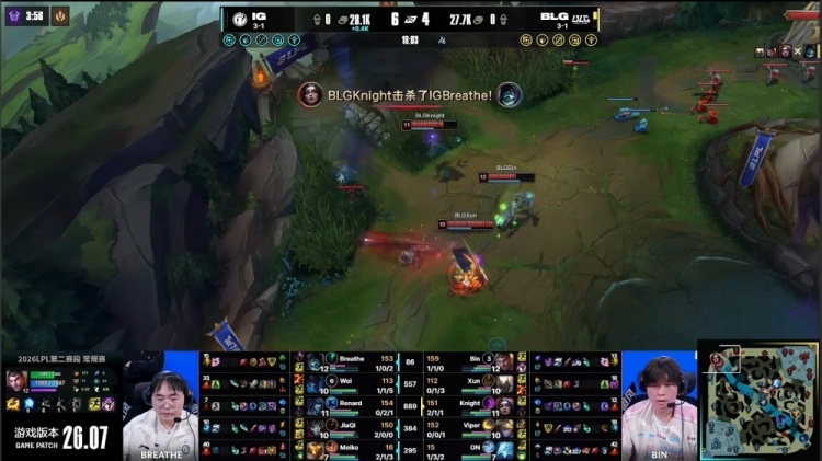 【15:31】ON冰鸟自家野区被JiaQi烬开大狙掉,Xun潘森随后跳大去上,BLG三人抓掉Breathe掘墓,BLG上路放出先锋撞掉iG一塔,Meiko上路金住Bin杰斯,JiaQi烬再拿Bin大哥人头,knight妖姬下路推掉iG一塔。