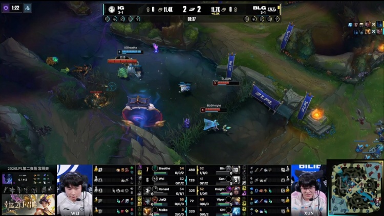 【22:31】大龙团,ON再送Breathe掘墓人头,前者研发i6,JiaQi烬点掉Bin大哥,Xun潘森跳大飞后排击杀Meiko,iG三人自家野区拉扯Xun,JiaQi打掉Xun拿到第6个人头,iG经济领先2.8k。