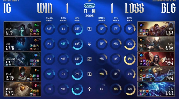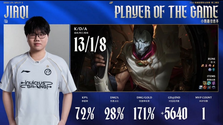 第二局前期iG通过连续逮捕ON逐渐打开局面,JiaQi持续发力成为核心输出点。BLG虽然依靠Xun多次主动开团试图找机会,但未能有效限制JiaQi烬的发育。