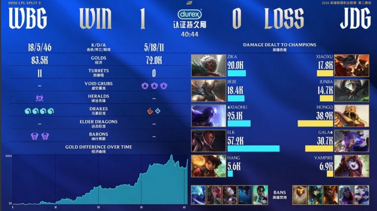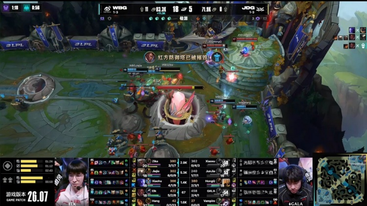 后期Junjia蝎子多次大空气,WBG持续推进,经济优势逐渐来到一万以上,最终WBG纯种水龙魂加持,推掉JDG三路水晶后强势推平JDG基地先下一城。