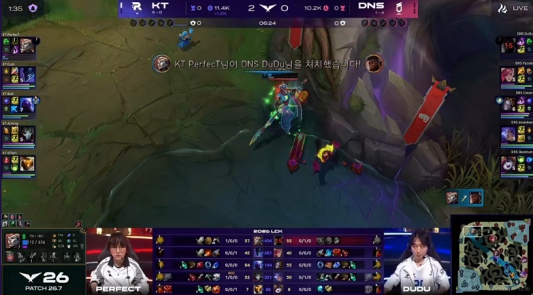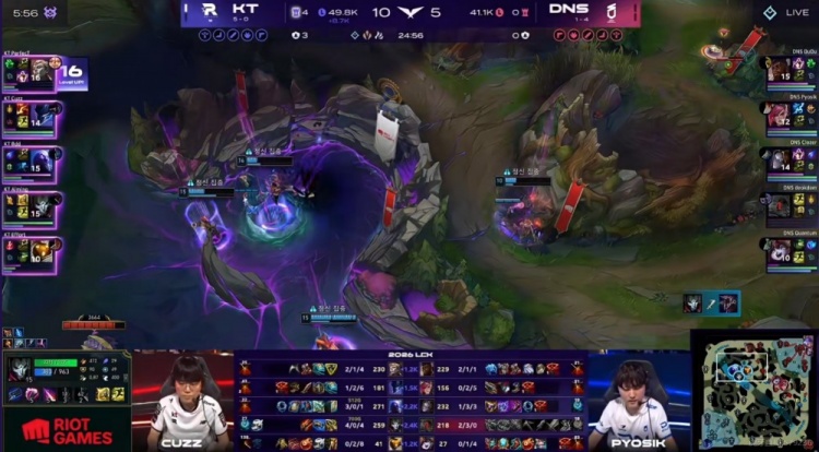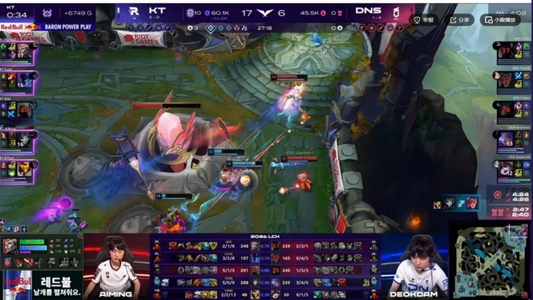 25分钟KT拿下海克斯龙魂,DNS想来看又被Effort巴德大招留住了上中两人!回头野区团战Pyosik蔚白给,正面带着璐璐大招的deokdam芸阿娜站桩打不过Bdd瑞兹被单杀,KT拆掉两路高地!虽然Bdd瑞兹被强杀但是Aiming烬配合队友收割了团战!KT一波结束比赛!拿下六连胜!
