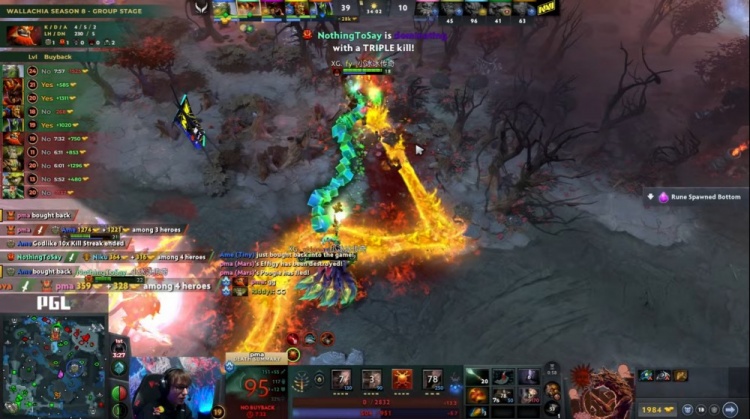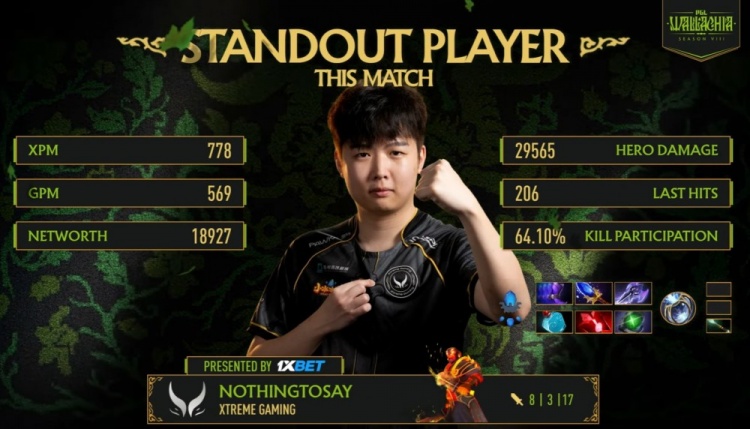 中期pma玛尔斯上路再次遭重送NTS人头,XG三人随后开雾上路再抓juice美杜莎,后者换掉森哥,哥哥小小进场再拿双杀,XG打出2换3,随后吃掉魔晶给到森哥,森哥蝙蝠单杀Riddys大树,哥哥小小与X哥doom经济全场前二,XG经济领先1w2k。