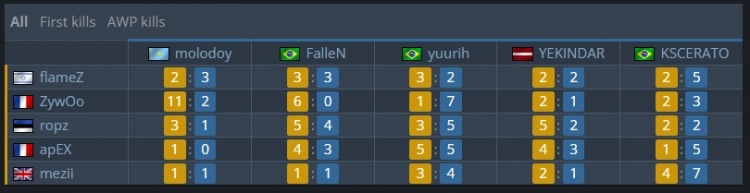 Vitality:mezii、apEX、ropz、flameZ、ZywOo