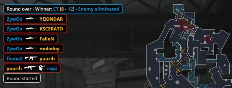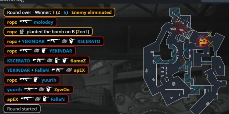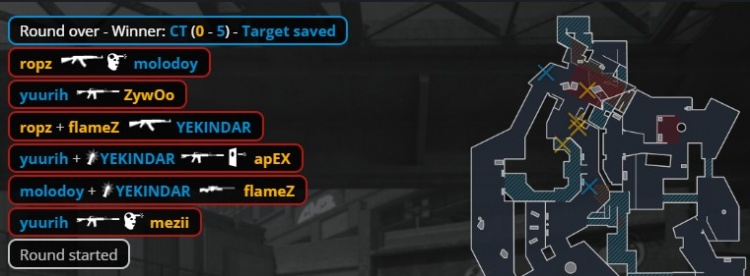 第7回合ropz长管换掉教父,mezii进B打掉yuurih,Zywoo轰掉卡神,小蜜蜂拿到首分。