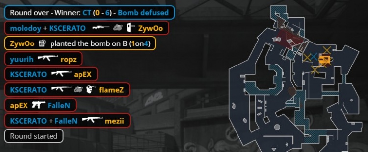 暂停回来,Zywoo下水道大狙隔墙穿掉molodoy,教父与卡神看长管换掉火仔与mezii,ropz再拿双杀进B,apex双杀收尾,小蜜蜂连拿3分。