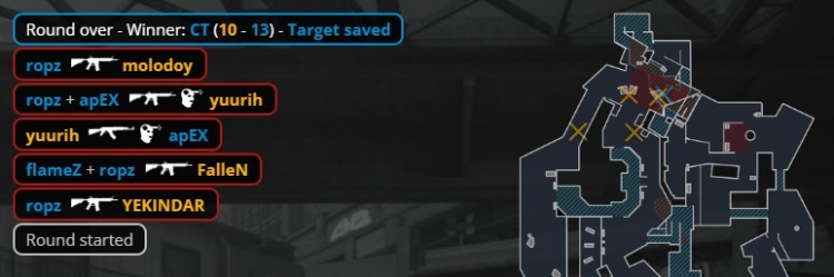 第22回合,下水道卡神长管混烟打掉mezii,molodoy来A大轰掉ropz,Zywoo继续轰掉molodoy,apex埋伏厕所近大远小双杀yuurih与教父,Zywoo出下水道被工地卡神打掉,残局2v2,卡神与狂哥进B打掉apex下包得手,火仔三楼上被烧保枪,黑豹拿到第10分,小蜜蜂喊出暂停。