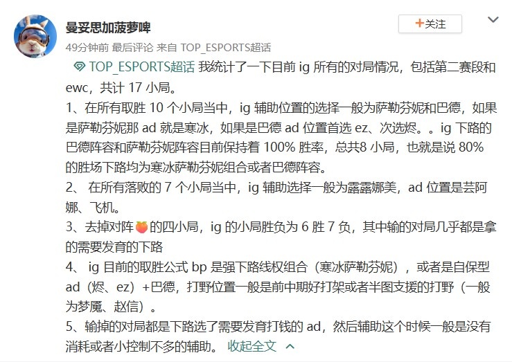 直播吧4月19日讯 今日LPL第二赛段TES将迎战IG,滔搏超话粉丝出谋划策,分析了IG的下路双人组的BP情况,具体如下:
