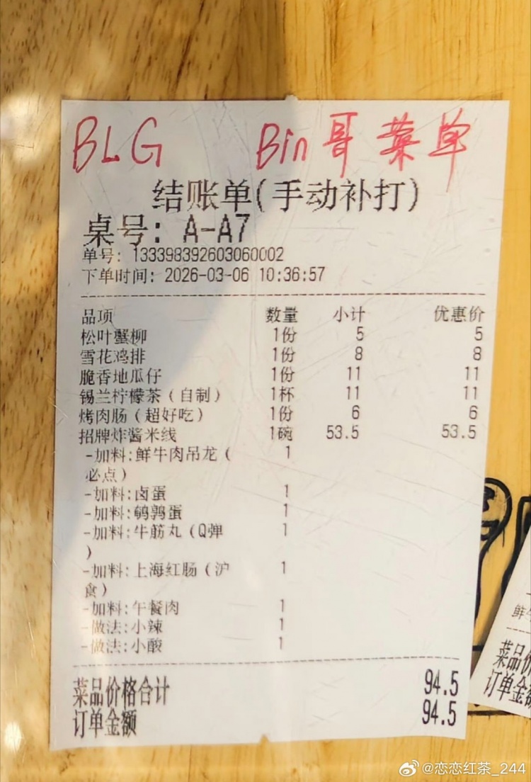 Q:之前去吃edg米线,有你的同款菜单流出,粉丝们看到你额外加了很多料,好奇你有吃完吗?