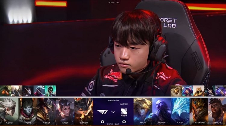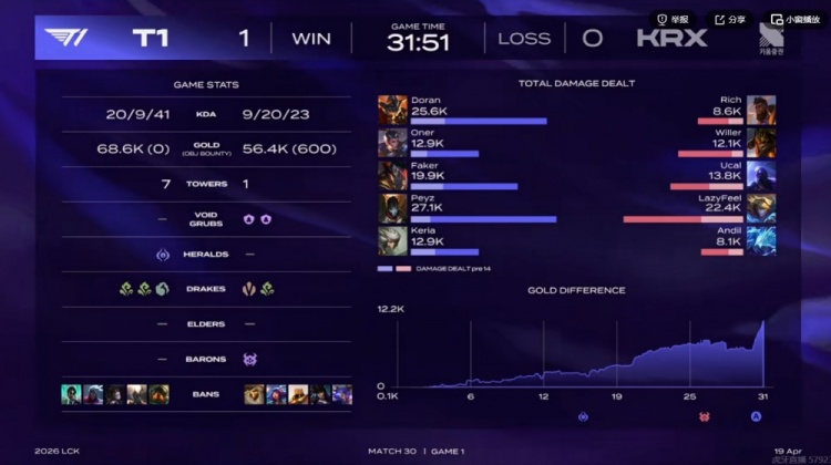 首局比赛Keria选出辅助青钢影,前期带起节奏帮助T1全线优势和卡牌被动拿下经济的领先!中期T1先拿听牌龙但是双惩戒被Willer皇子用命抢到大龙,随后Doran兰博白给还送一条小龙没拿到炼金龙魂!最终的中路团离谱的来了!ucal瑞兹开车带着LazyFeel伊泽瑞尔直接开到了T1中路双塔之间只能跑了!正面T1形成多打少TIMING逐个击破,最终0换5团灭KRX之后一波结束首局!