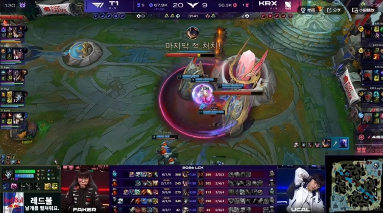 【20:28】Peyz烬中路换血之后开大,Keria青钢影直接盖大越塔强杀KRX下路组之后自己被Willer皇子换掉!随后Faker卡牌飞下配合队友留住willer皇子!T1拆掉中一塔!逐步扩大经济差!