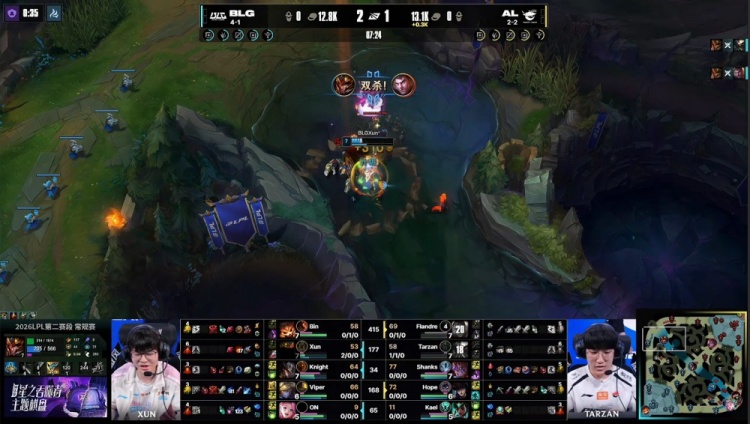【24:48】AL强吃小龙未果,Xun将小龙抢掉,双方各拿两条小龙,BLG推掉AL中路二塔,经济领先6k。