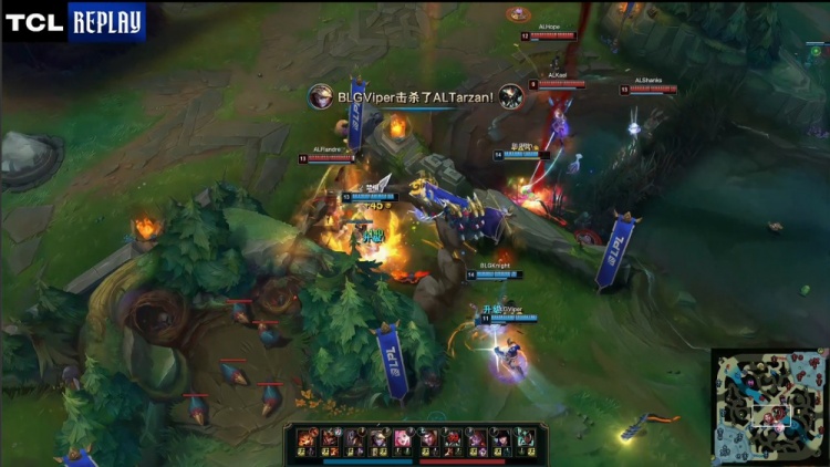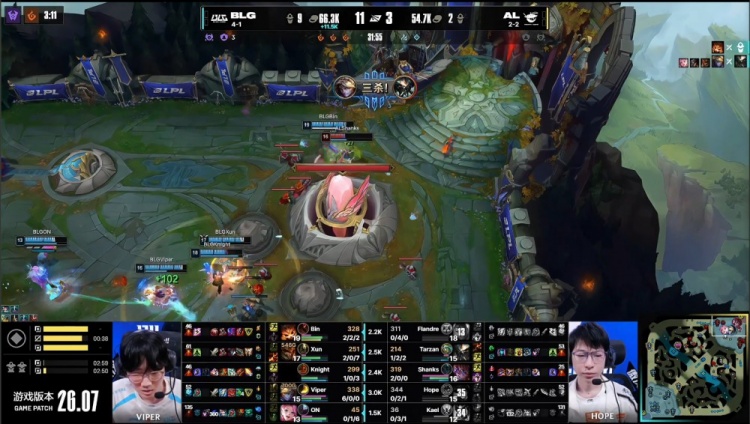 【25:19】中路团战,Viper伊泽瑞尔不断poke,Tarzan蝎子被打残,随后双方持续拉扯,Kael卡尔玛野区做视野被Viper击杀,BLG下路推掉AL中路水晶,经济领先8k。