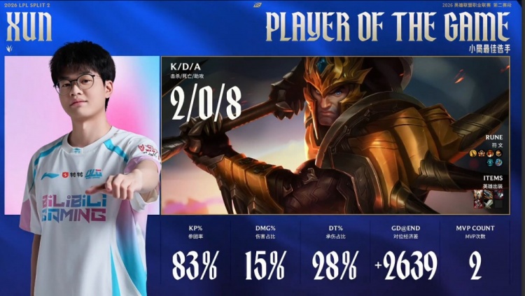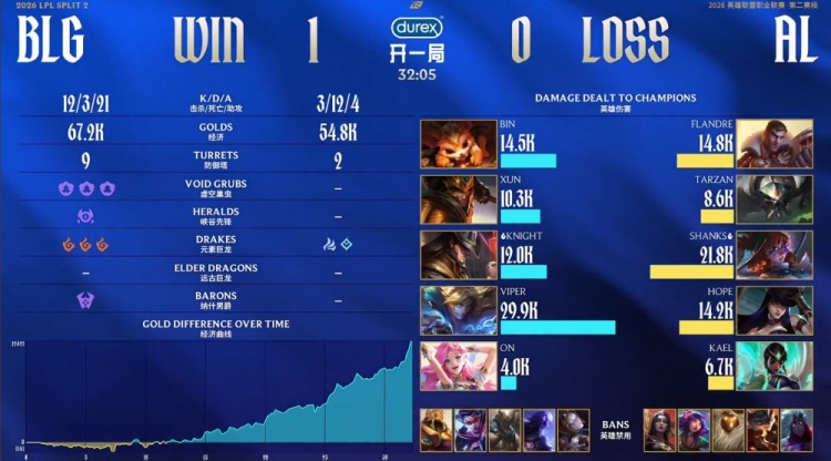 关键节点在大龙决策,BLG抓住AL多人下路击杀Bin哥的机会,轻松控下大龙。后期在装备与视野全面压制下,BLG持续推进碾压正面团战,一波结束比赛,稳稳拿下首局。