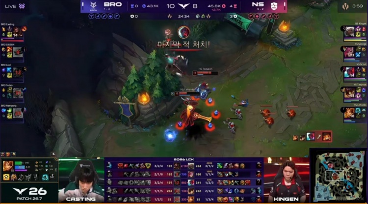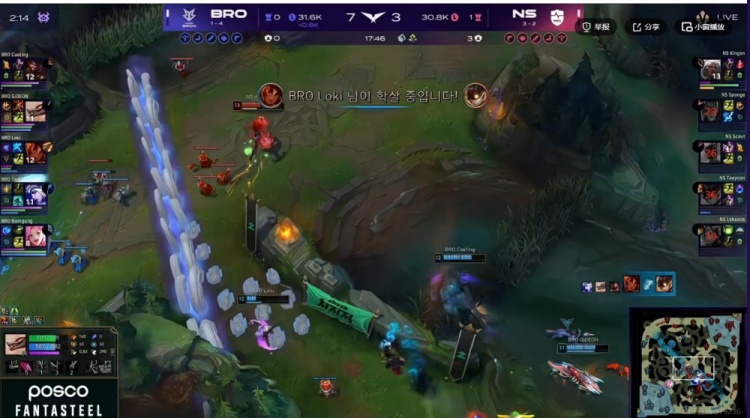 第三局比赛4分钟BRO三人包下强杀Taeyoon炸弹人,但一血给到了Namgung萨勒芬妮!11分钟Casting纳尔上路单杀Kingen安蓓萨!NS则是拿下两条小龙!