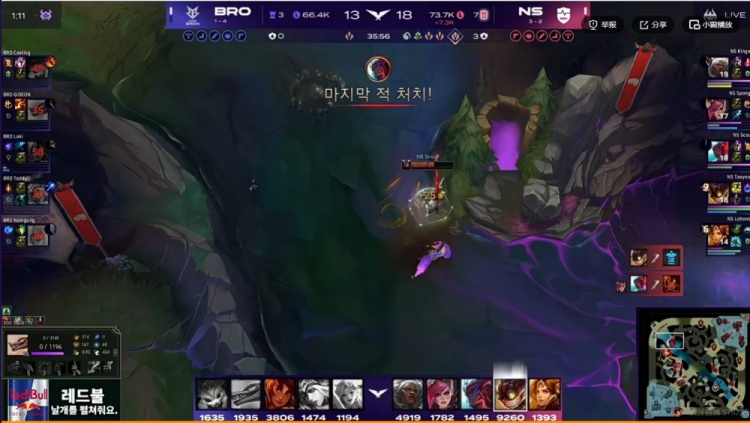 24分钟小龙团过后BRO想反打,结果被集火的Sponge蔚有焚天吸了一口没死,Scout永恩大招支援配合队友瞬秒BRO中野,随后NS两人打大龙,三人河道草埋伏又是一波0换3完成团灭!NS拿下大龙!领先4K了!