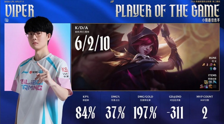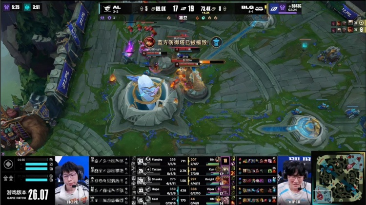 关键转折出现在中后期团战,双方多次在边线与野区拉扯,AL三人下路上高未果遭Xun潘森三杀。Viper霞随后帮助BLG拿到土龙魂。