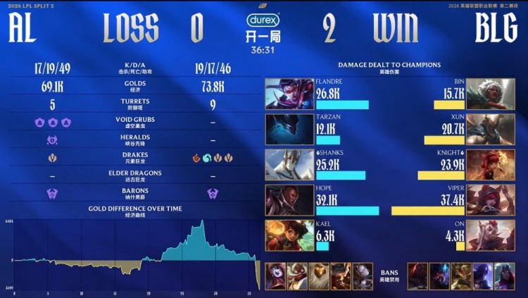 AL中路反复拉扯去开大龙,knight安妮果断闪现拍住AL野辅将其融化拿到双杀,BLG吃掉大龙团灭AL,AL痛失好局,BLG一波推平AL基地,完成逆转拿到比赛胜利。