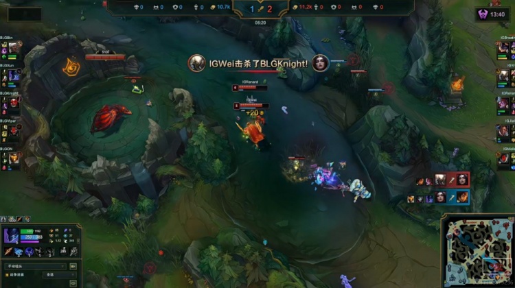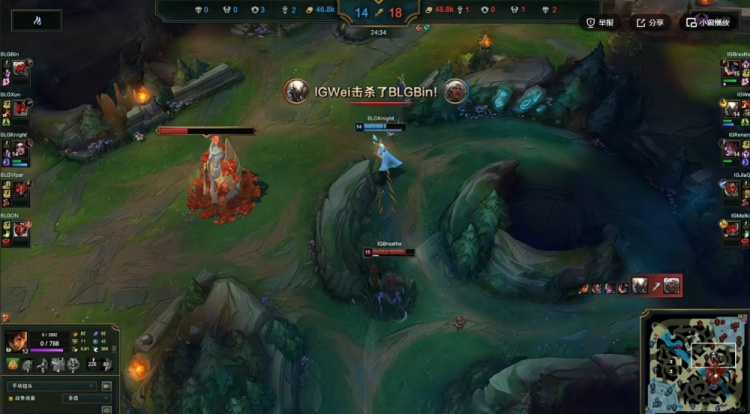 【13:20】BLG三人越上强行打出0换2,knight乐芙兰双杀!但是同步下路的Viper烬被iG双人组线杀!随后下河道双方又是一波辅助互换!Viper烬刚复活回到中路又被Wei潘森逮捕了!
