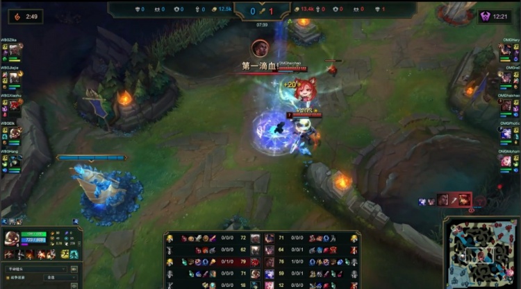 第一局前期Photic艾希一箭去中击中Xiaohu让haichoa拿到一血,但后续Jiejie潘森各路gank稳住局势,WBG下路双人组先杀OMG双人组,Hery兰博养出天肥Zika安蓓萨,WBG打开局面。