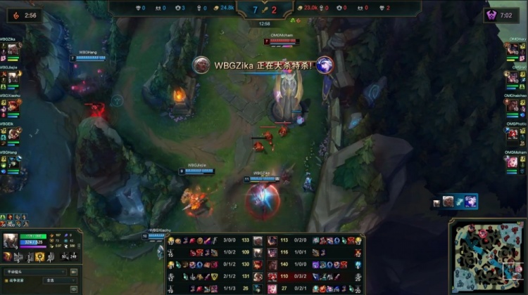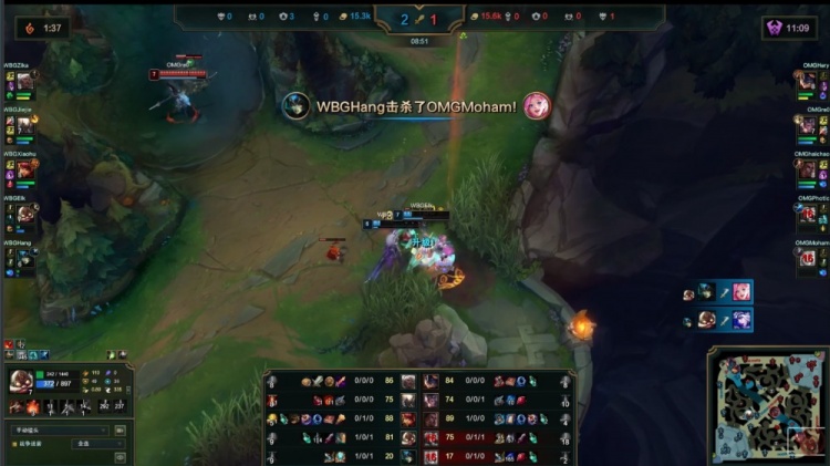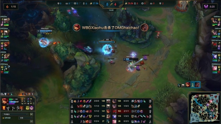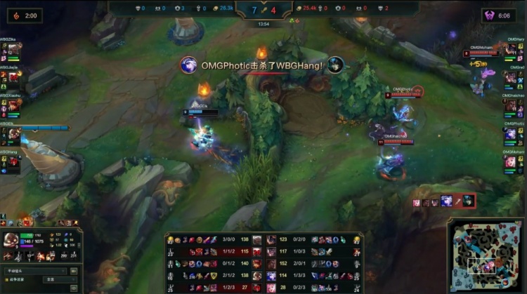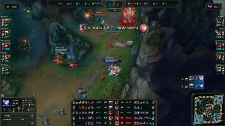 【11:25】Jiejie潘森跳大去下,WBG三人再杀Photic与Moham萨勒芬妮得手,紧接着xiaohu安妮去上支援,Hery兰博再次遭重,WBG打出0换3,经济领先1.7k。