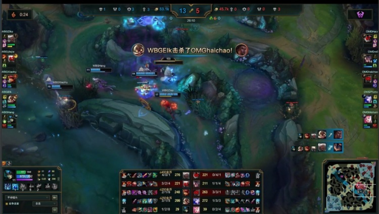 【13:53】河道团战,haichao梅尔E闪定两人,WBG野辅被杀,Photic吃到hang娜美人头,OMG打出0换2。