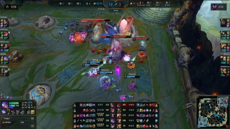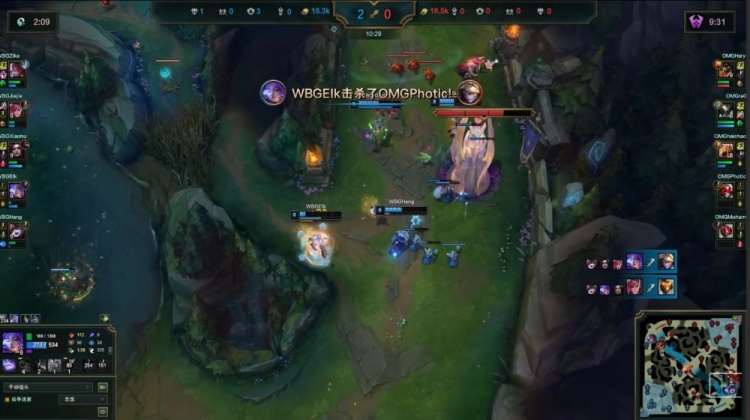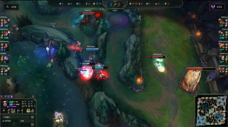 中期团战WBG配合流畅,多点开花持续滚动雪球,OMG难以组织有效反击,20分钟WBG经济优势来到1w以上。