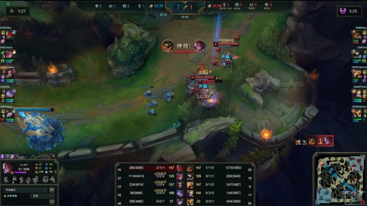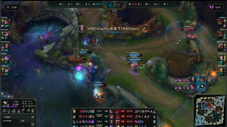 【23:25】WBG团灭OMG后吃掉大龙,WBG下路推进,haichao与Hery直接睡着,WBG撤退再杀一波,Zika阿萝拉开大轻松双杀,WBG打出0换4再上OMG高地推掉基地拿到比赛胜利。