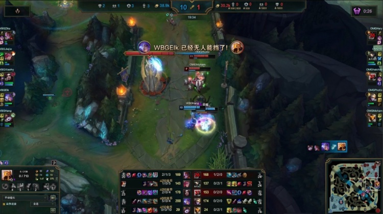 【19:05】小龙团,xiaohu妖姬残血逃生,Elk与Zika带队冲锋,Hery鳄鱼穿梭被Elk终结,Elk再杀haichao沙皇,双方拉开,WBG下路持续追击,Jiejie与Zika越高地塔被杀,WBG打出2换4,经济领先9k。