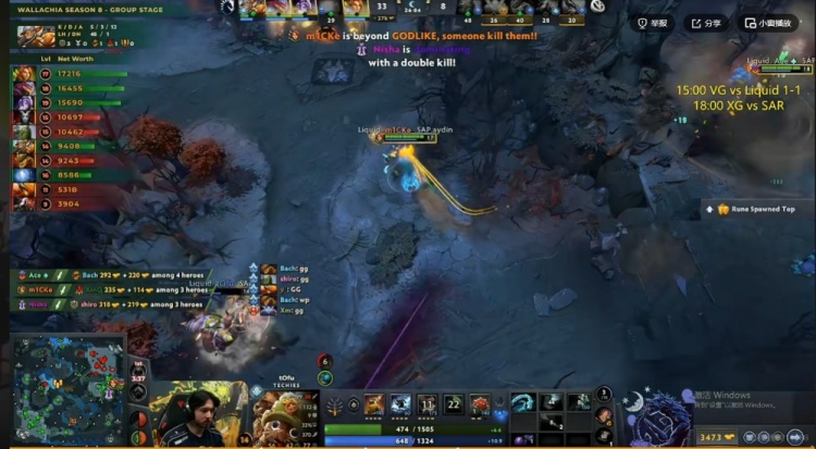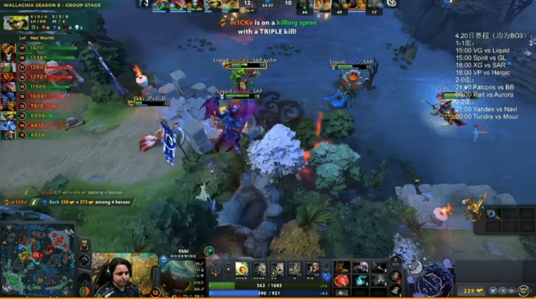 中期Liquid连续扫图抓单,Bach钢背兽更是连续出门就被击杀!18分钟Liquid已经冲上高地强杀XinQ墨客,拆掉上二塔之后拉开经济差到接近15K了!20分钟Liquid轻松拿下魔晶!