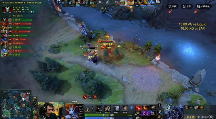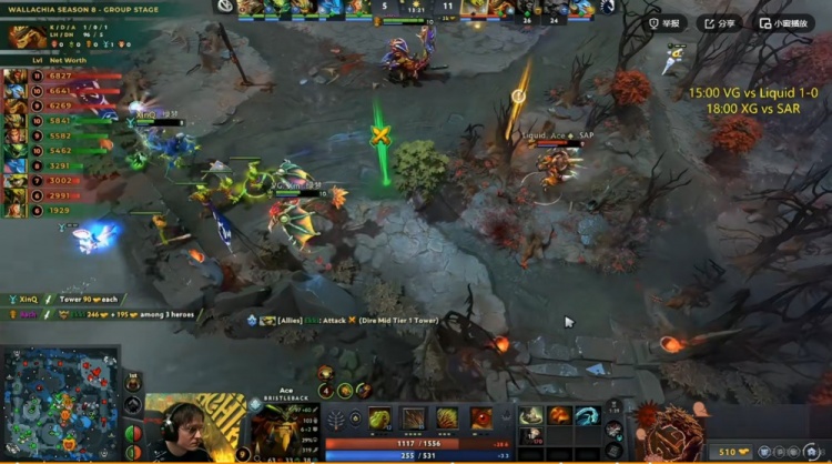 一级团VG打出1换2但是双酱油连续被线杀,7分钟Liquid抱团gank上路打出0换2之后VG陷入三路劣的局面!12分钟Liquid五人齐上路越塔强杀打出0换3,这波过后Liquid已经拿下6K经济优势!