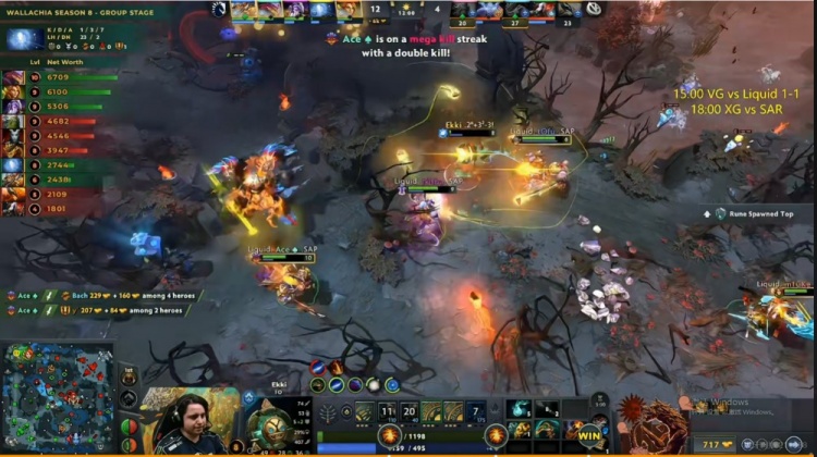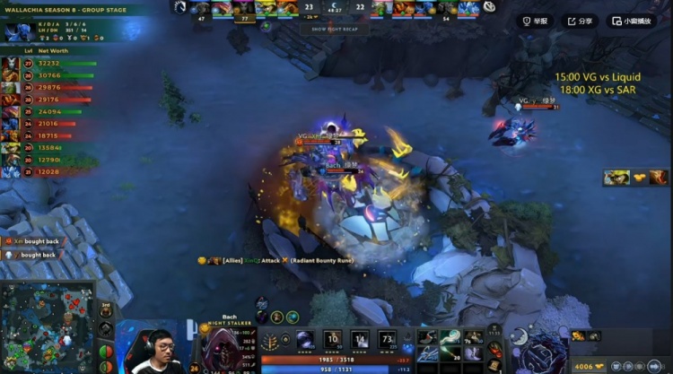 22分钟Liquid拿下肉山,VG在自家高地下想抓人但是伤害根本不够!XinQ被反杀交出买活也没保住shiro小小!这波Liquid轻松打出0换3,将经济差扩大到21K!24分钟XinQ墨客被抓,买活死之后Liquid站上下路高地,先后强杀Xm女王+Bach钢背兽之后再破一路撤了!不给机会!随后的下路团VG费尽心思打掉了盾+小精灵之后没输出了,m1CKe风行者收割超神,VG又被让一追二击败,掉入1-2组!