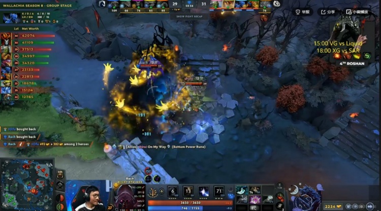 29分钟肉山团,Liquid抱团rush掉了之后让Nisha兽王带盾,随后y队小鹿被留,Bach沙王反手进场买一送一了!Liquid的0换2!随后Liquid先后抓死VG双大哥,上高!VG交出双买活但是留不住人!经济差瞬间被拉开到17K!Liquid拆掉上路高地之后转中,VG一波反打没能秒掉Ace钢背兽,自己被Liquid逐个击破,被团灭之后敲出GG!