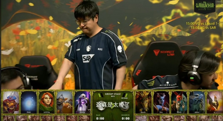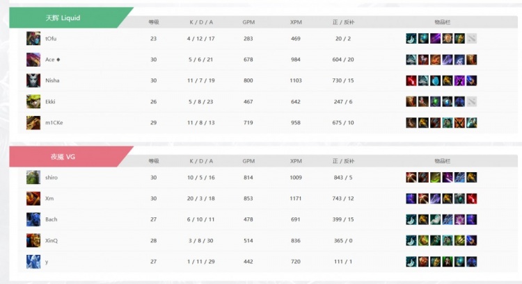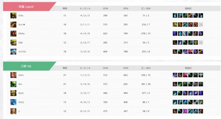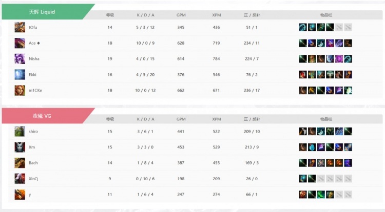 天辉Liquid:Nisha痛苦女王、Ekki森海飞霞、Ace石鳞剑士、t0fu神谕者、m1CKe钢背兽