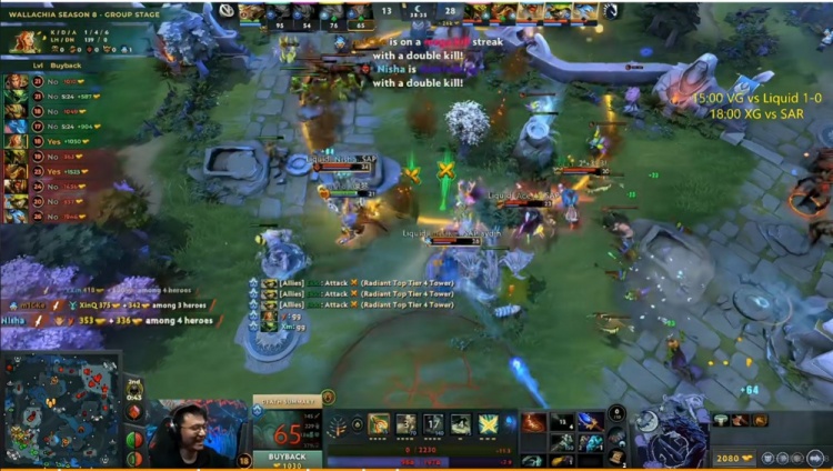 61分钟团战XinQ蝙蝠空拉白给交出买活,但是侧翼Bach夜魔被强杀买活死!Liquid想拆上路高地但是兵线被断了!只能撤了!65分钟中路团战Xm火猫圣剑+买活强行游龙,VG阵容还是太能拉扯了!双方交出所有买活人换人,最终是Nisha女王被小小+冰魂切死!VG完成对Liquid的团灭!shiro小小带队直接一波基地,VG终于赢下第一局近70分钟的比赛!