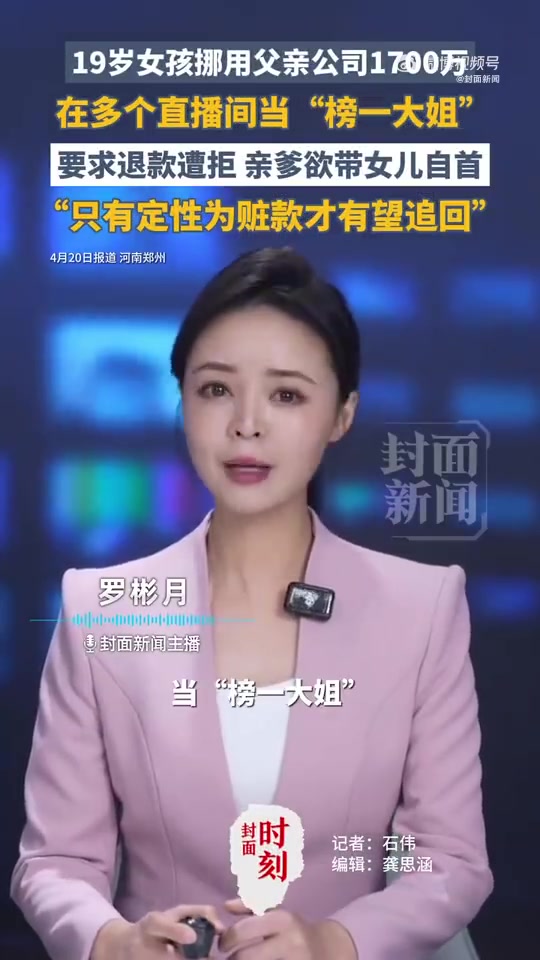 相关阅读:19岁女孩挪用自家1700万当“榜一大姐” 亲爹带女儿自首:坐牢才有可能追回钱款