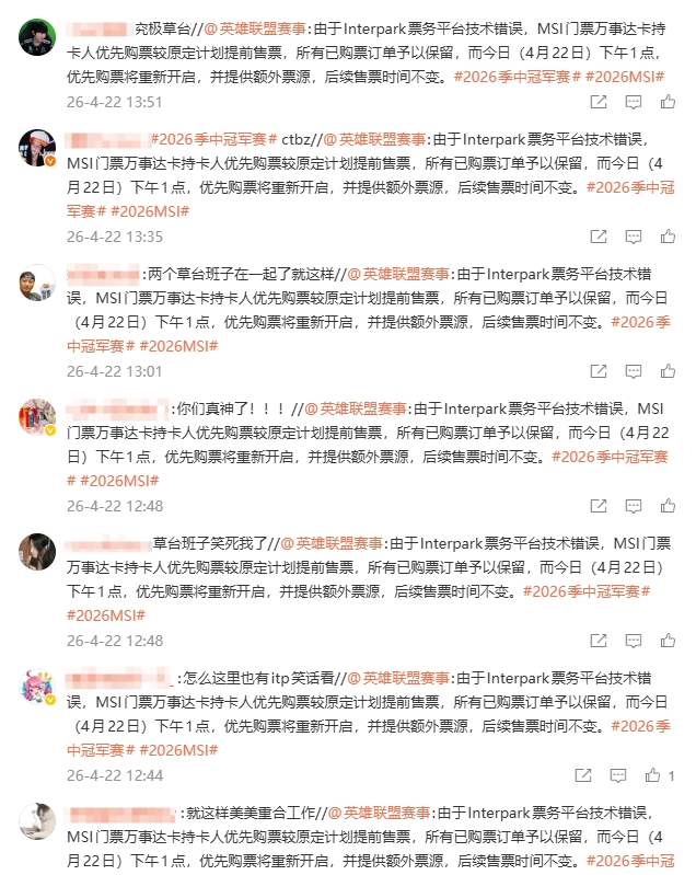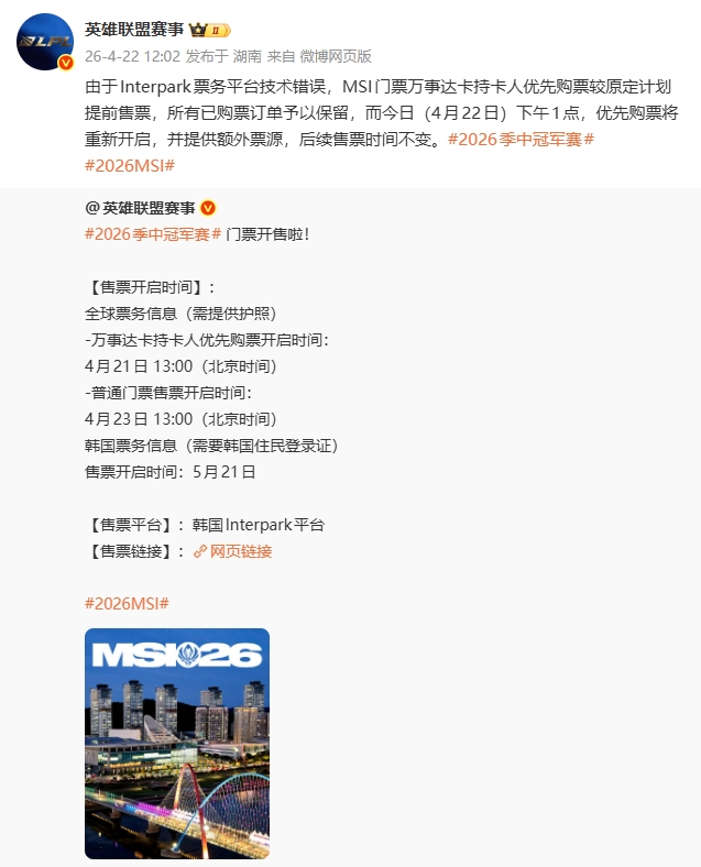 直播吧4月22日讯 昨日下午LPL官方在微博上公布MSI 2026韩国大田会展中心开票,根据官方消息原定万事达卡持卡人优先购票时间为昨日13点后,但疑似票务平台出现技术故障,导致万事达卡持卡人在13点前就能够提前购票,随后官方今日致歉。