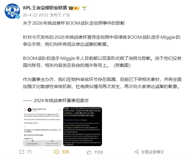 针对今天发布的2026年挑战者杯宣传定妆照中菲律宾BOOM战队选手Miggie的争议手势,我们向所有观众表达诚挚的歉意。