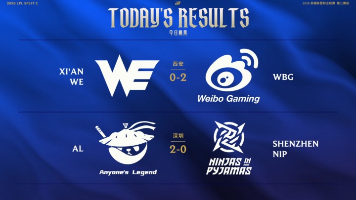 直播吧4月22日讯 今日的LPL第二赛段的两场比赛已经结束,首场WE以0-2的比分不敌WBG至今未能取得一场胜利;第二场AL状态回暖以2-0的比分横扫NIP。