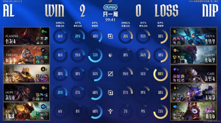 第二局bp端NIP最后一手给打野Guwon选了个巨魔导致自己阵容没控!AL下路组这局对线正常了就全线优势!虽然上路Flandre塞恩送了个单杀但是中期AL借助换线让他得到喘息机会!AL持续拉开经济差,21分钟AL直接抱团rush掉大龙,Tarzan琪亚娜回马枪1V3的局面还拿下双杀!这波AL团战获胜之后拆掉对手中路高地,再度扩大优势!