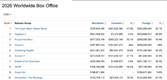 直播吧4月23日讯 据最新全球票房统计,任天堂旗下动画电影《超级马力欧银河》大电影全球累计票房已达 7.52 亿美元(约合人民币 54.1 亿元),正式超越《飞驰人生 3》的 6.41 亿美元,登顶 2026 年全球票房冠军。