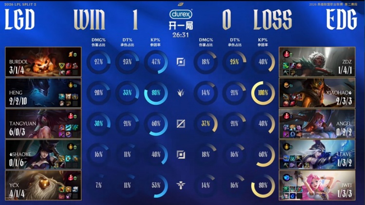 直播吧4月23日讯 2026LPL第二赛段常规赛组内赛继续进行,今日涅槃组比赛由EDG对阵LGD!