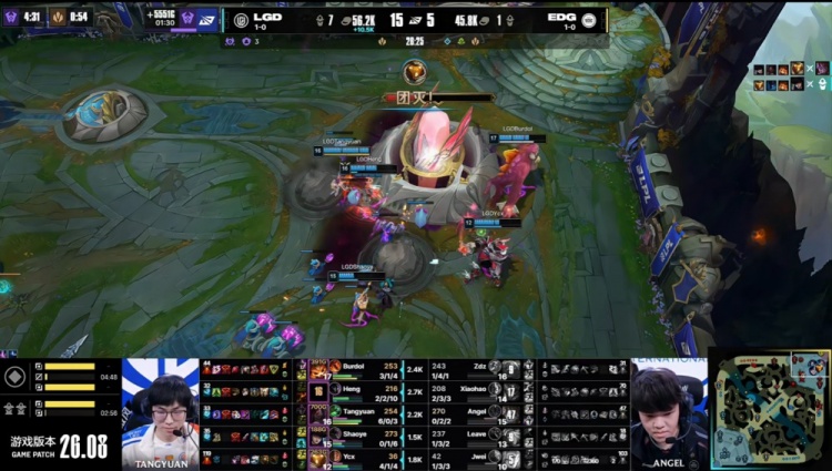 中期Burdol纳尔下路1v3被杀,龙魂团Tangyuan阿卡丽率先切掉Shaoye艾希,LGD打出1换3阻止EDG拿到土龙魂,LGD经济领先3.5k。中路团战EDG双人组再次遭重,LGD打出0换2回头吃掉大龙,经济领先接近6k。LGD中路推进,Tangyuan阿卡丽爆轰三杀,LGD一波推平EDG基地先下一城。