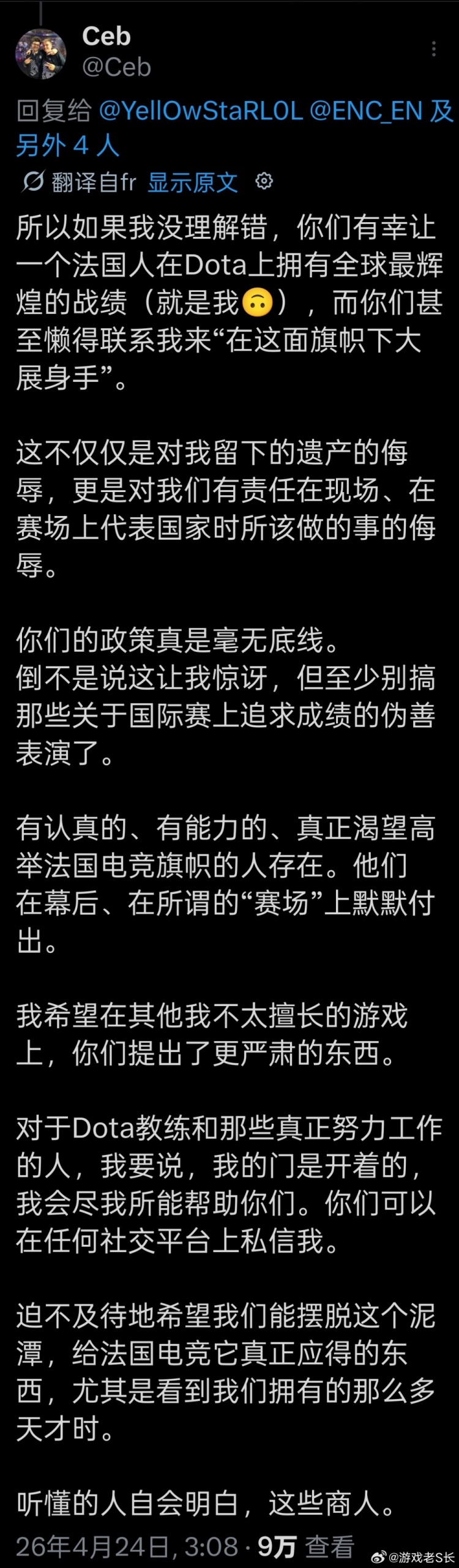 直播吧4月24日讯 知名职业选手、Ti双冠王CEB未能入选法国DOTA2国家队,随后他发文怒喷选拔选手的人员、前LOL职业选手YellOwStar,具体如下: