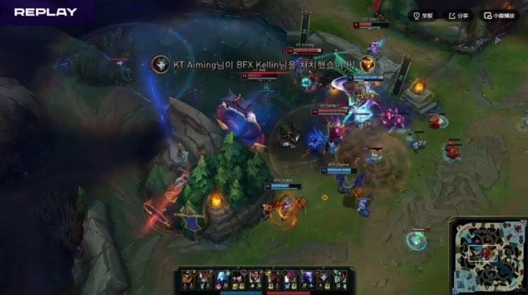 中期KT中野压制强势扫图!14分钟野区团战虽然Raptor赵信开大强行击杀掉了Cuzz巨魔但是最终还是KT的1换2!随后KT先锋团再强杀Daystar冰鸟,拆掉上一塔之后拉开3K多经济差!BFX则是拿下先锋之后强拆KT中一塔,KT换掉了下一塔+听牌龙!21分钟中路团Kellin巴德金两个,但是正面团仍然是KT的1换2!