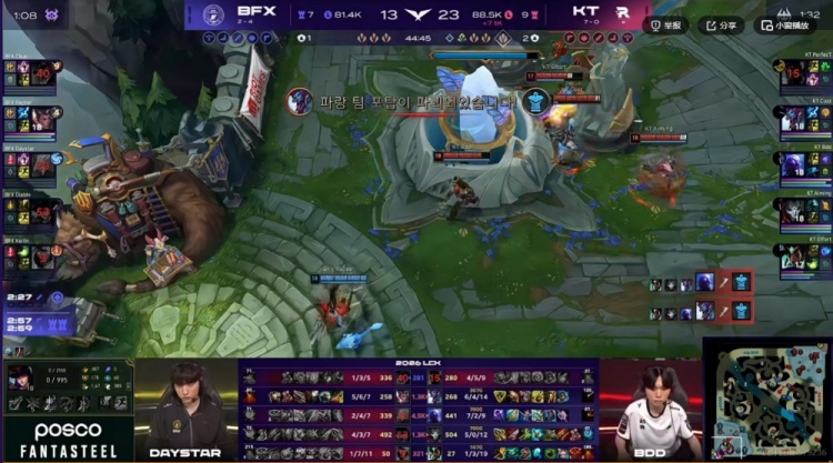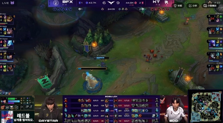 直播吧4月24日讯 LCK常规赛继续进行中,今天的首场比赛是境况不佳的BFX对阵“榜一大哥”KT!