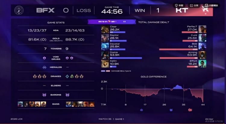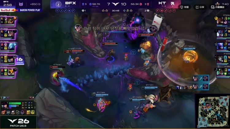 23分钟龙魂团,KT先落位,但是Clear鳄鱼绕后拉扯+Kellin巴德金两个帮助Raptor赵信抢到了小龙!后续团战KT阵型被拉扯,BFX集火逐个击破打出0换3!再拆对手下一塔!经济平了!