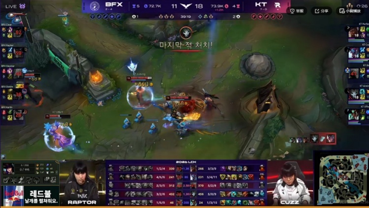 34分钟BFX再拿小龙!纯土龙魂听牌了!但是Bdd瑞兹绕后配合队友强杀掉了BFX双C!残局BFX撤退,Raptor赵信立功,带着复活甲+防御塔换掉了KT两个!这波最终是KT3换4,KT也没办法一波!