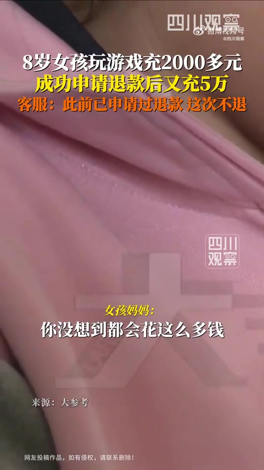 直播吧4月24日讯 据四川广播电视台《四川观察》及河南广播电视台民生频道《大参考》报道,一名 8 岁女孩在游戏内首次充值 2000 多元后成功获得退款,此后再次通过同一设备和支付渠道充值 5 万元,相关退款申请被游戏公司拒绝。