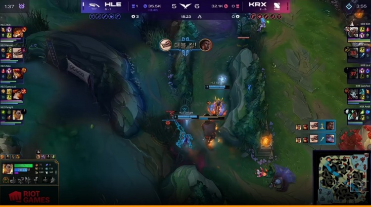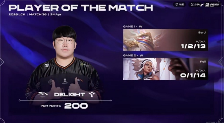 第二局比赛前期HLE越上帮助Zeus纳尔对位压制,中期HLE连续拆塔扩大优势但是Zeus纳尔上路失误白给+Kanavi纳亚菲利连续白给也让自己的推进之路受到了阻碍!几波关键的物件团Delight芮尔展现芮尔王风采,连续先手强开配合上Zeka安妮或者是Gumayusi女枪大招减员KRX,HLE借助团战的胜利拿下大龙之后结束比赛,收获本赛段的第7胜,战绩牢牢紧跟榜首的KT!