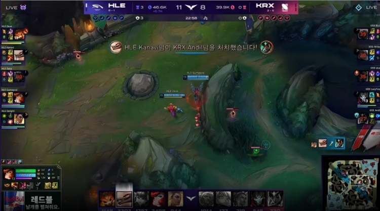 【25:17】下路团战Rich安蓓萨绕后直接被处理掉,HLE两路分推拆掉中下两路高地!Gumayusi女枪扫大赶人,侧翼Kanavi纳亚菲利一个锁头差点给Andil卡尔玛秒了!HLE抱团推进结束比赛,拿下第7胜战绩紧跟KT不放!